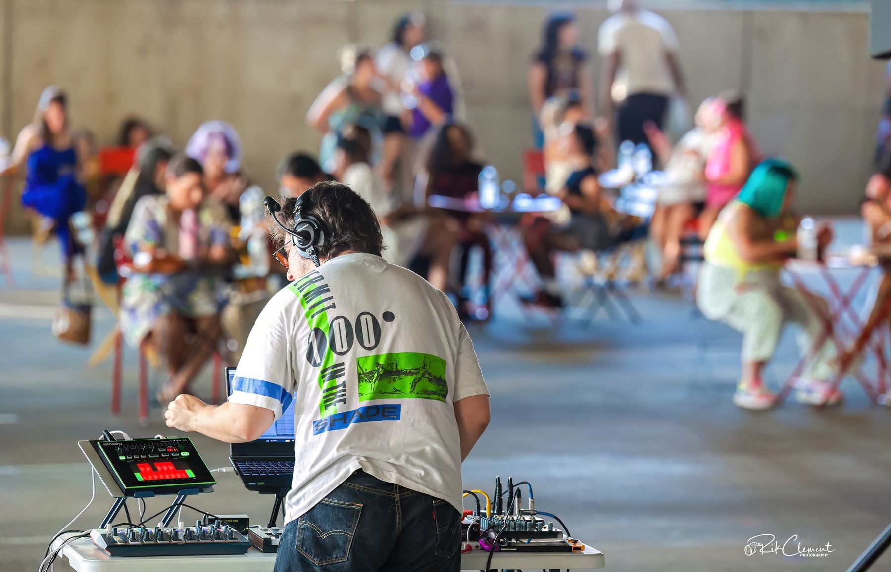 Last Thursday, July 11, the 100 West Garage in the first floor of a Downtown Tulsa parking garage was transformed into a vibrant hub of music, fashion, and art. As the sun began to set, excitement filled the air, and people started to gather. At 5:30 PM, the evening kicked off with local musician Peter Tomshany taking the stage. His soulful guitar melodies and innovative electronic drum beats created an inviting atmosphere, drawing more and more attendees into the heart of the event.