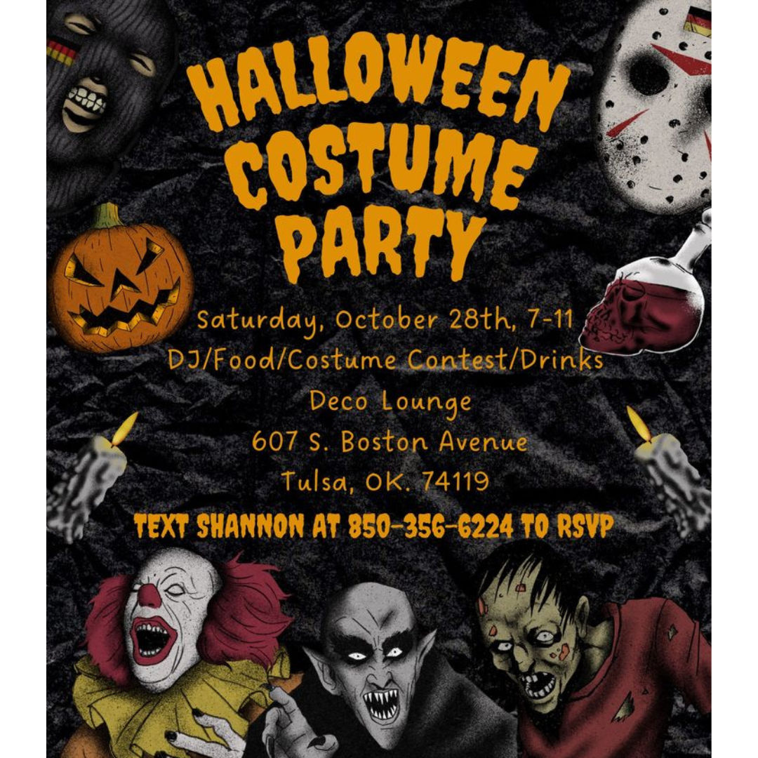 Join us if you dare for a wickedly good time at Downtown Tulsa's cocktail lounge! Get ready for an unforgettable evening filled with fantastic music from a talented DJ, delicious food, an exciting costume contest, and a wide range of drinks to quench your thirst. Whether you're seeking a casual atmosphere or simply looking to have a blast, Deco Lounge is the place to be. Come and be part of the excitement as we create unforgettable memories in Downtown Tulsa.