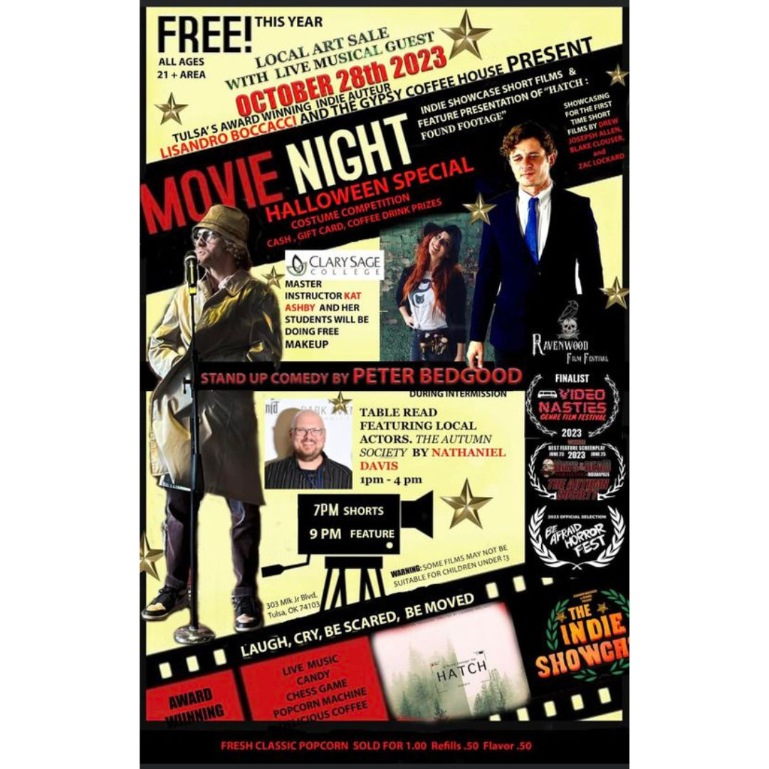 Join us for a fantastic and free event brought to you by Lisandro Boccacci and co-hosted by Gypsy Coffee House. They'll be screening locally made short films with a total runtime of 2 hours. During the event, there will be an intermission filled with diverse entertainment, including live music and stand-up comedy by Peter Bedgood. Afterward, get ready for a captivating feature presentation of "Hatch: Found Footage." What makes this event even more special is that the filmmakers themselves will attend to discuss the making of "Hatch." It's a unique opportunity to immerse yourself in the world of independent cinema and connect with the creative minds behind the magic. Don't miss this evening of film and entertainment!