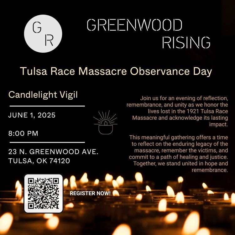 To close the weekend, attend the Tulsa Race Massacre Candlelight Vigil on Sunday, June 1 at 8 PM at Greenwood Rising (23 N. Greenwood Ave). This is a time for reflection, remembrance, and unity—a moment to honor the lives that were taken and to stand in solidarity with the community as we continue to tell the truth of this history.